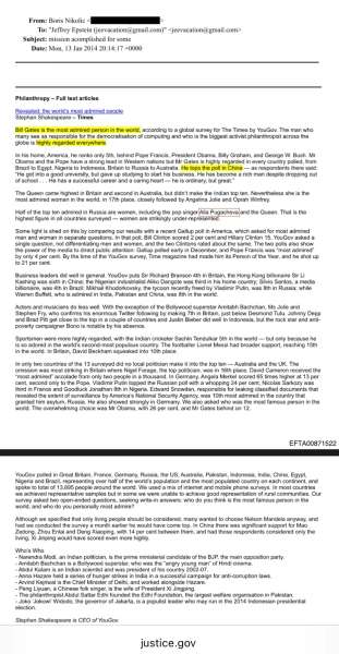 Говорится также о Билле Клинтоне, Анджелине Джоли, Джастине Бибере, Ричарде Брэнсоне, Брэде Пите и других публичных людях. Все они в итоге, либо оказались замешаны в скандале, либо были связаны каким-то образом с Эпштейном. Примечательно, что в теме письма написано: «Mission accomplished for some», — что в переводе означает — «миссия выполена для некоторых».