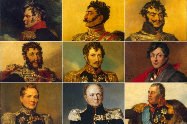 Портреты кисти Джорджа Доу: Алексей Ермолов, Валериан Мадатов, Давид Делянов, Яков Кульнев, Киприан Крейц, Александр Остерман-Толстой, Карл Толь, Александра I, Михаил Кутузов. Фото: Коллаж АиФ