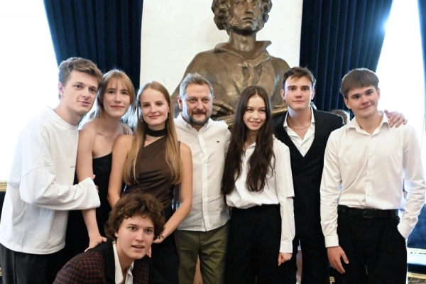 Художественный руководитель Евгений Писарев (в центре) с молодыми актерами из нового состава во время сбора труппы Московского драматического театра имени А. С. Пушкина в преддверии открытия 76-го театрального сезона. Фото: РИА Новости/ Екатерина Чеснокова