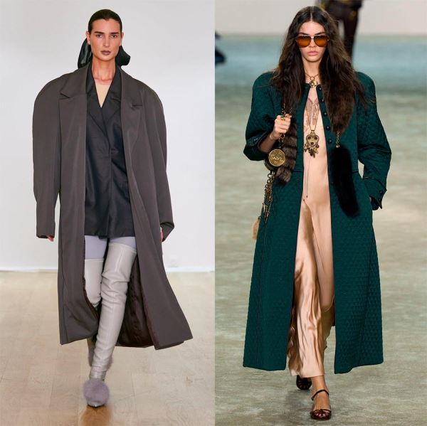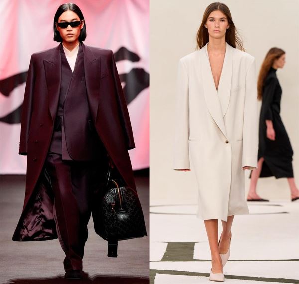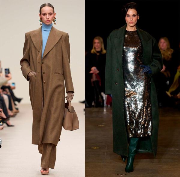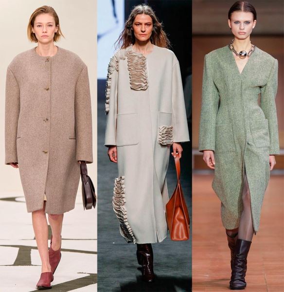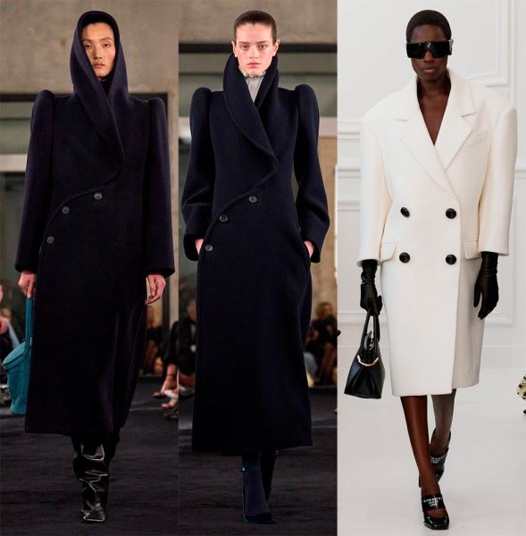 Широкие плечи в пальто дизайнеры создают за счет удлинения плечевой линии, при этом в одном случае плечи могут быть округлые (с мягким кроем), как в пальто силуэта «кокон», а в другом – линия плеч четкая, прямая, например, в пальто прямого силуэта.