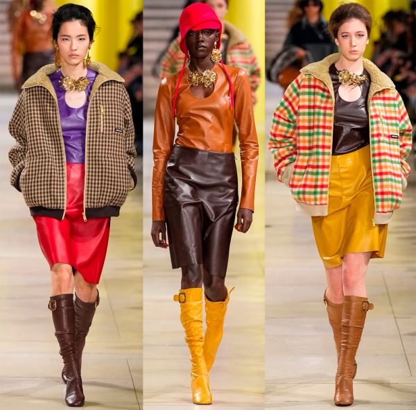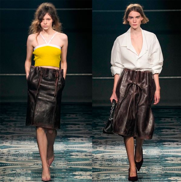 При покупке важнее сфокусировать внимание на выделке материала и цветах. Новый сезон делает акцент на кожу с выделкой, где есть текстура, а не блеск и глянец, хотя блестящие кожаные вещи тоже уместны в новых образах. В тренде изделия из кожи с эффектом поношенности – это может быть совсем новый плащ или настоящий винтажный тренч, а может, юбка, как в коллекции Prada.