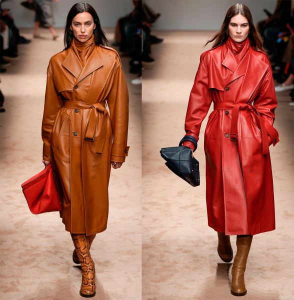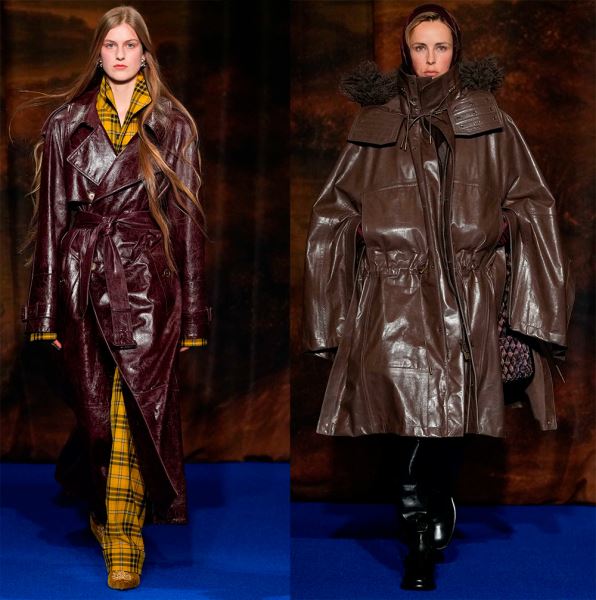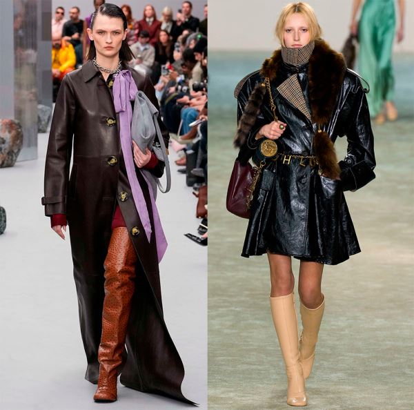 Коллекции осень-зима 2025-2026 предлагают множество самой разнообразной одежды из натуральной кожи различной выделки – гладкие, глянцевые, фактурные, зернистые и тисненые варианты. На равных в моде изделия из экокожи, которая по своим внешним характеристикам совсем неотличима от натуральной, а еще актуальны виниловые плащи, куртки и другая одежда.