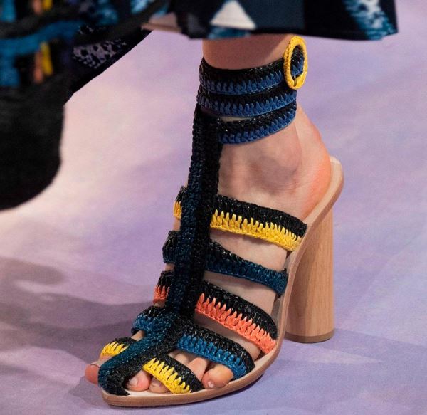 В сложном переплетении ремешков на босоножках из коллекций 2020 дизайнеры часто делают акцент на большом пальце. Это заметно и потому, что модной обувью лета 2020 стали вьетнамки. В привычных босоножках часто сделана дополнительная перемычка для большого пальца, либо он, наоборот, единственный остается “на свободе”. Практичность этого тренда остается под вопросом.
