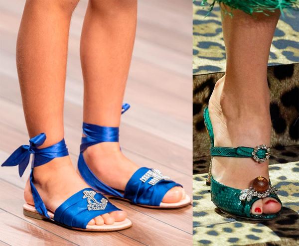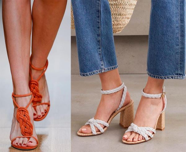 Все, что связано с обилием переплетений и завязок на обуви модно этим летом. Хитроумные переплетения можно увидеть у моделей из многих летних коллекций. Если у босоножек длинные ремешки-завязки, их по-прежнему модно завязывать вокруг щиколотки или прямо поверх брюк.