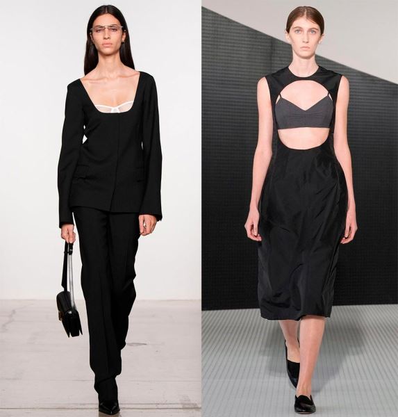В новом сезоне дизайнеры предложили носить очень глубокие и широкие декольте, при этом дополнять образ бандо-топами или бра, за счет чего достигается соблазнительная элегантность. Помимо платьев, вырезы могут украшать топы и блузки.