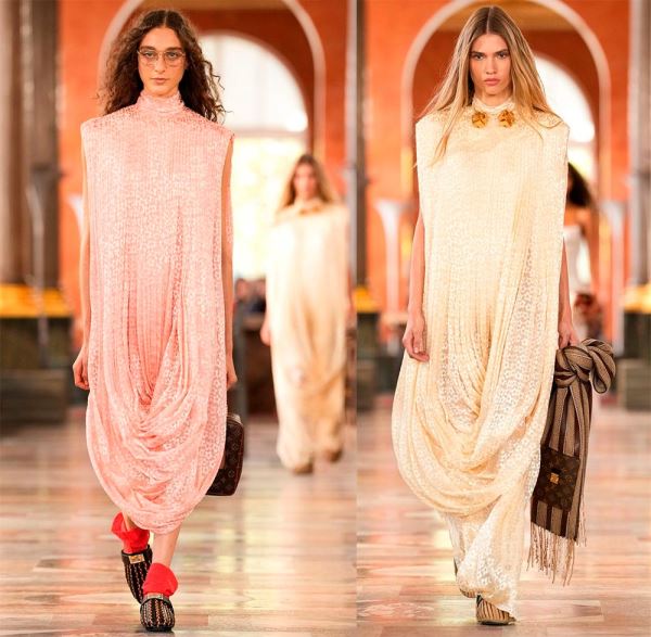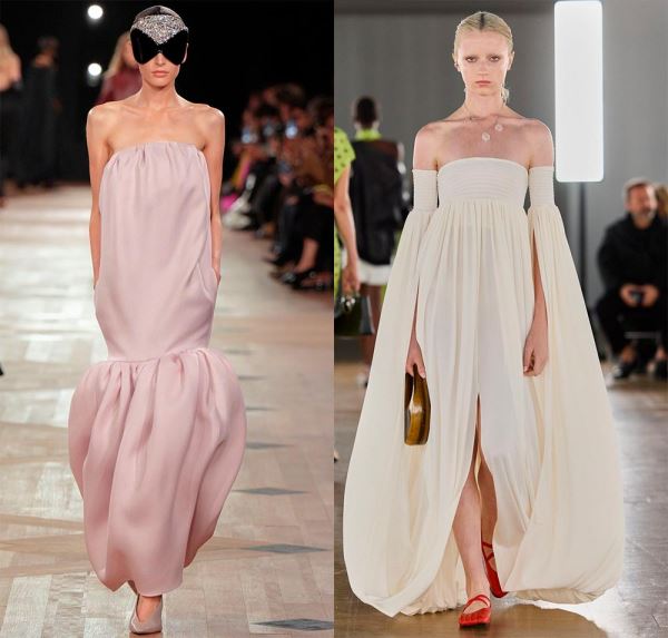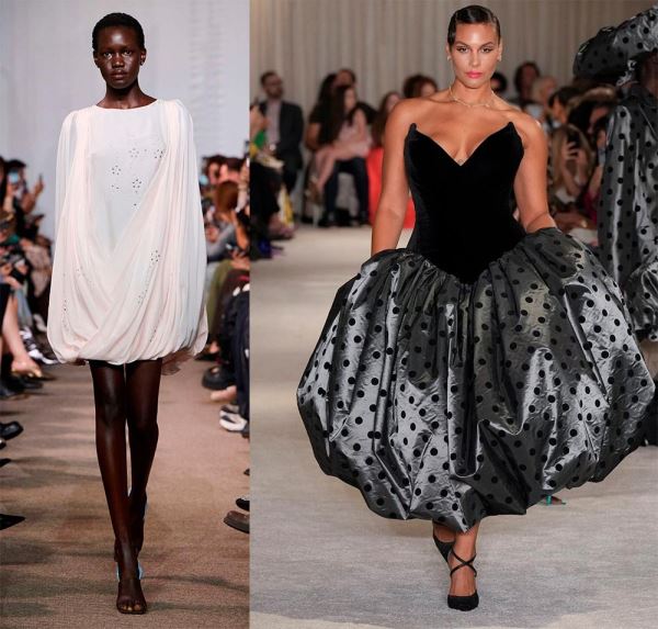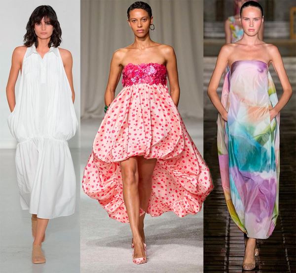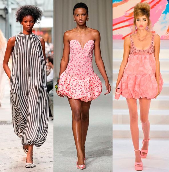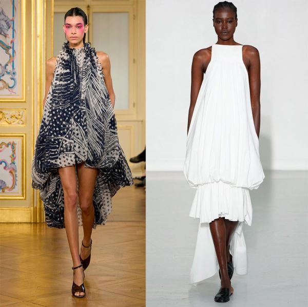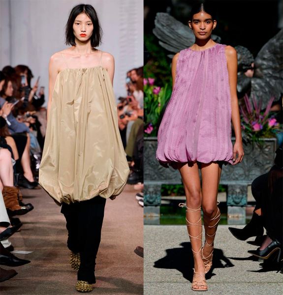 Интересные интерпретации фасона показал бренд Coperni, где рукава также выполнены в подобном крое и сливаются с платьем, образуя форму кокона. Или бренд Louis Vuitton, в коллекции которого платье-баллон приобретает новые и смелые вариации силуэта.