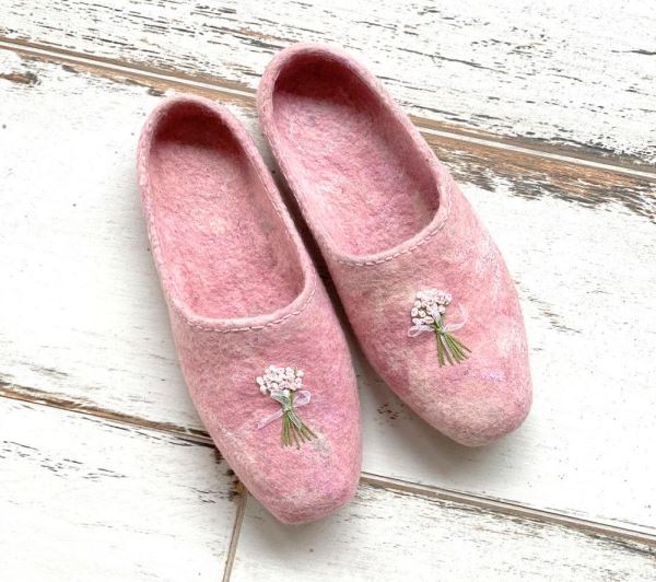 Эти очаровательные тапочки нежного розового оттенка, украшенные изящной вышивкой, изготовлены по особой обувной технологии из тонкого, но плотного войлока, что делает их универсальными спутниками как для дома, так и для неспешных прогулок. Мысок усилен натуральной кожей, что гарантирует износостойкость, а уникальный состав из шерсти итальянского мериноса и немецкого бергшафа обеспечивает естественную терморегуляцию: ногам будет тепло зимой и нежарко летом.
