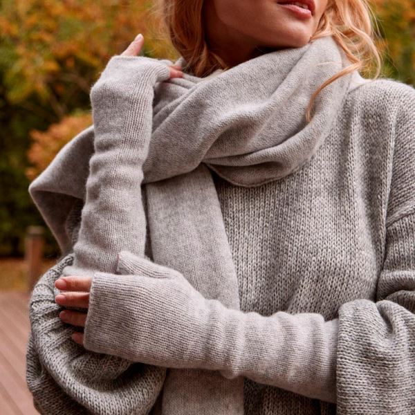 Этот комплект создан из нежнейшего мериноса высочайшего качества. Многослойный шарф-платок и изящные митенки в техничном оттенке серого меланжа дарят не только тепло, но и ощущение тихой роскоши. Лаконичный оттенок делает комплект универсальным фаворитом, который будет актуален сезон за сезоном.