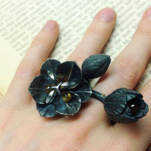 Сложная, детальная проработка лепестков и изящные линии создают невероятный объем и динамику. В сердцевине композиции горят солнечные цитрины, добавляя тепла и роскоши. Латунь с серебрением придает благородное сияние. Выразительный силуэт кольца делает его абсолютно самодостаточным, не нужно перегружать образ другими украшениями. Можно надеть его с простым чёрным платьем или однотонным свитером — и вы создадите завершенный образ