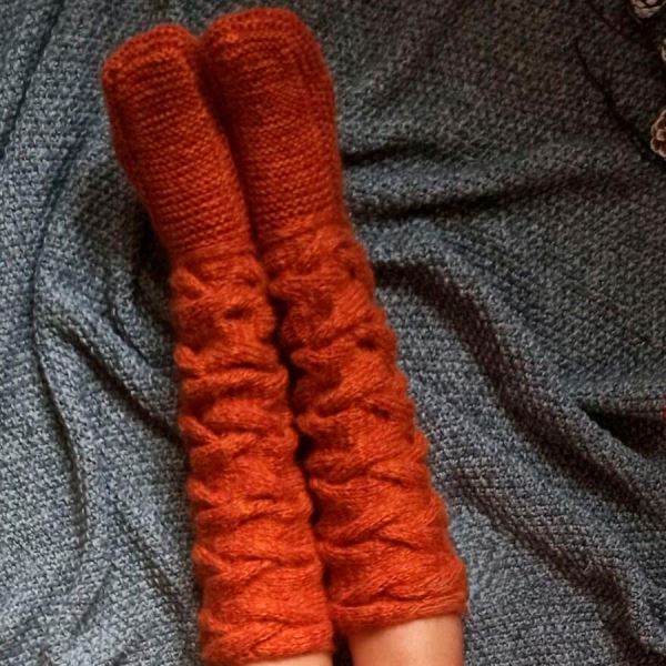 Объемные гольфы уютного терракотового оттенка выполнены вручную из особой пряжи — мягкой смеси шерсти и воздушного мохера, что обеспечивает исключительное тепло и невесомость. Анатомическая вязка гарантирует идеальную посадку по голени без сползания. Они станут спасением холодными вечерами дома, стильным аксессуаром для прогулок с уггами или валенками, а также выразительной деталью для камерной фотосессии.
